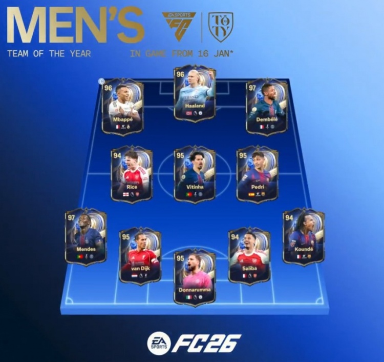 1月15日讯 EA已经官宣FC26的年度蓝11人阵容,该阵容由球迷票选产生,和此前博主爆料一致。姆巴佩队长,登贝莱和努诺·门德斯获评97最高。