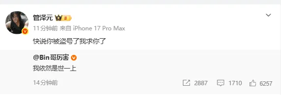 九游体育入口-管泽元转发Bin社媒:快说你被盗号了我求你了